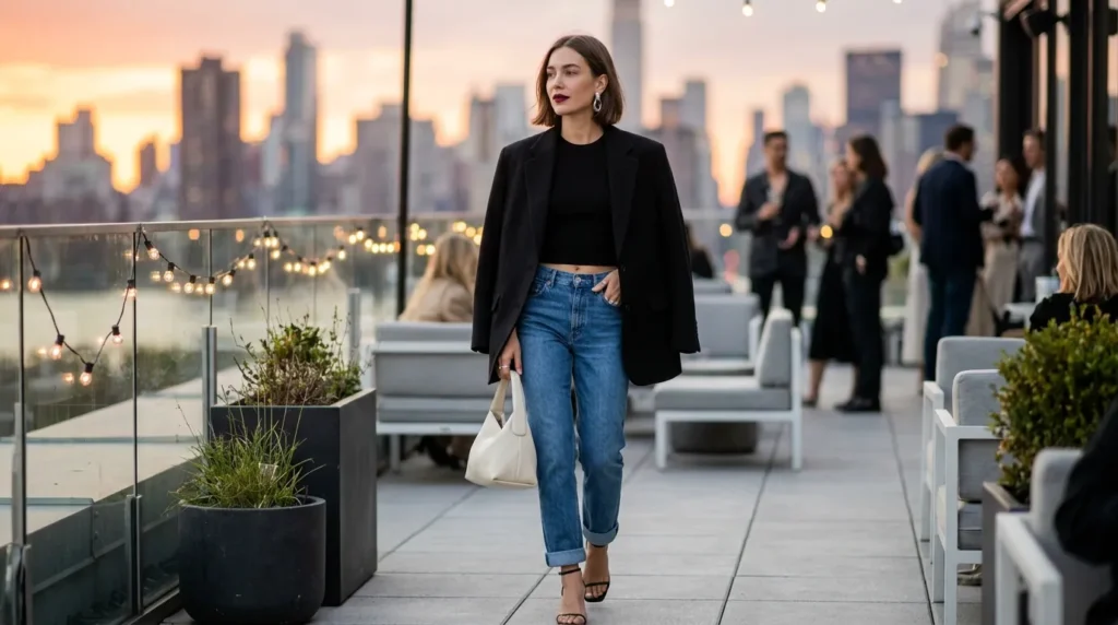 Some nights don’t need drama — they need cool, collected confidence. A cropped top, an oversized black blazer, and cuffed jeans deliver exactly that. It’s effortless. It’s polished. And it works for almost any casual evening situation, from dinner with friends to a rooftop party at sunset.