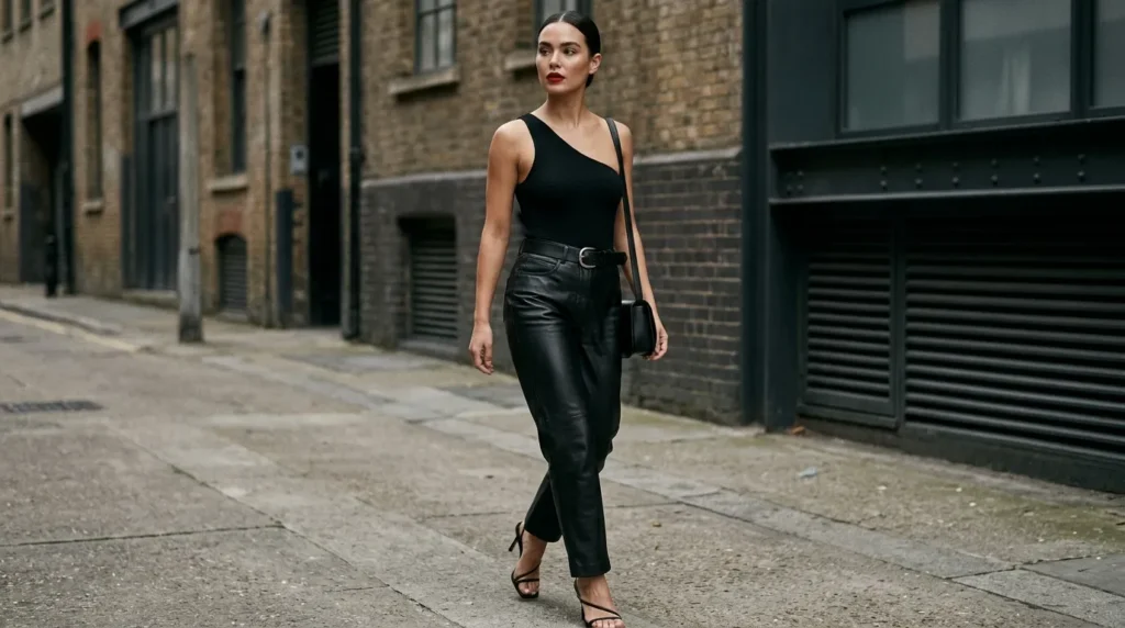 Don’t let the simplicity fool you. A one-shoulder bodysuit tucked into high-waisted leather pants is a full statement on its own. The belted waist gives it shape. The matte leather adds a luxurious, moody finish. There’s no sparkle here — and that’s exactly the point.