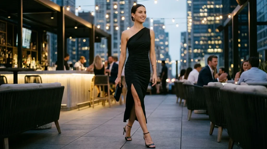 1Modern Noir EleganceOne-shoulder black dress, ruching, thigh slitCocktails, rooftop dinnerSophisticated