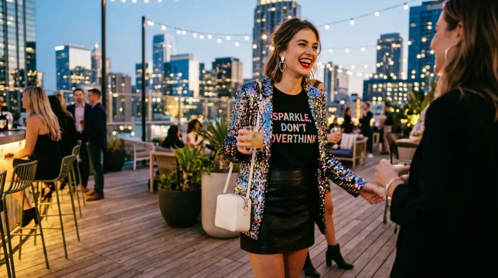 6Playful Sparkle EnergySlogan tee, sequin blazer, leather mini skirtRooftop bar, gallery nightFun & fearless