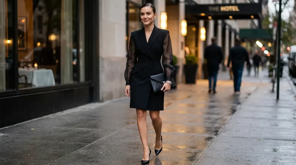 This is the look that quietly takes over any room it walks into. A fitted blazer dress, nipped at the waist, with sheer sleeves that soften the edge just enough. It’s feminine and strong in exactly the right measure. There’s no sparkle, no drama — just clean, confident lines doing all the talking.