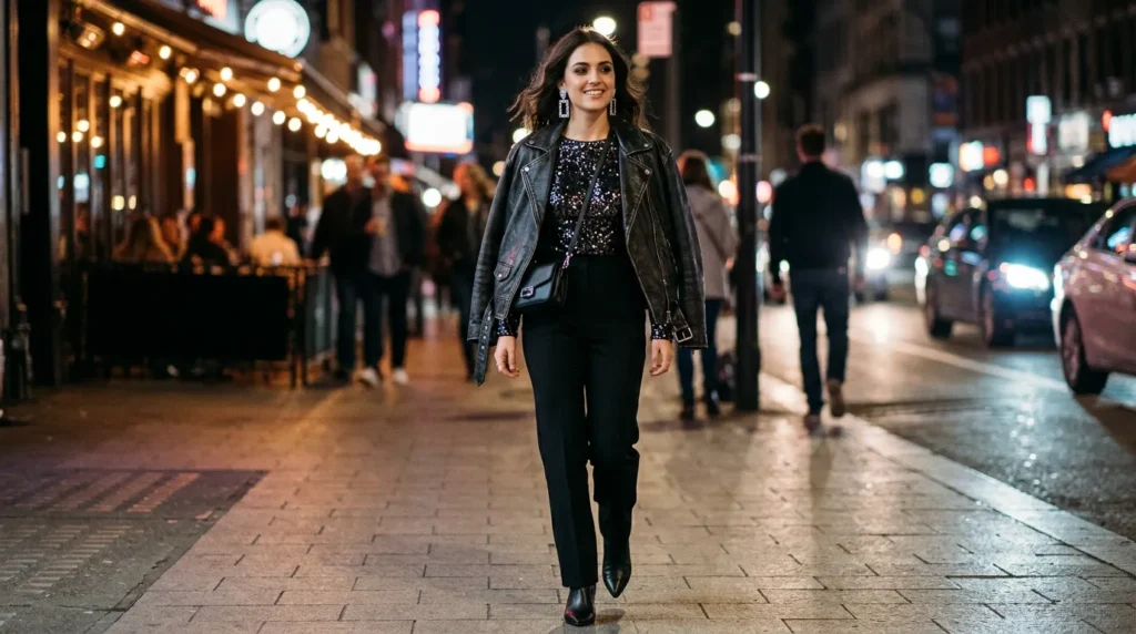 Now here’s where it gets interesting. A sequin top paired with a leather jacket sounds like it might be too much — but it works beautifully when you balance it with tailored trousers. The sequins catch every streetlight. The leather keeps it grounded. It’s urban high street at its absolute finest.