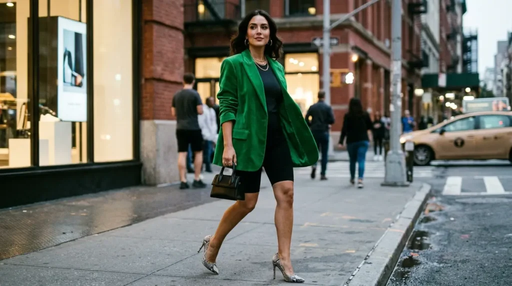 Here’s one that breaks every traditional “night out” rule — and that’s exactly why it works so well. An oversized emerald green blazer, snakeskin heels, and cycling shorts. Yes, really. It’s sporty and fancy all at once, and it carries the kind of street-cool energy that makes people actually stop and look.