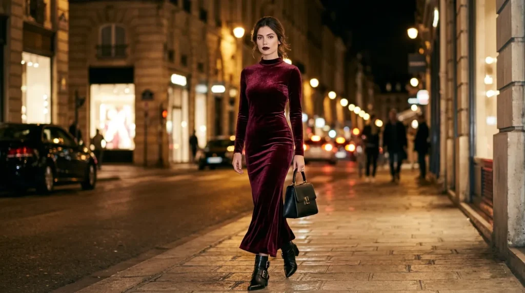 Velvet is officially back — and it’s not going anywhere soon. A rich burgundy velvet gown with a high neckline and a fitted silhouette is exactly the kind of glam night out fashion that feels both timeless and very right now. It’s soft, it’s indulgent, and it photographs beautifully under warm city lights.