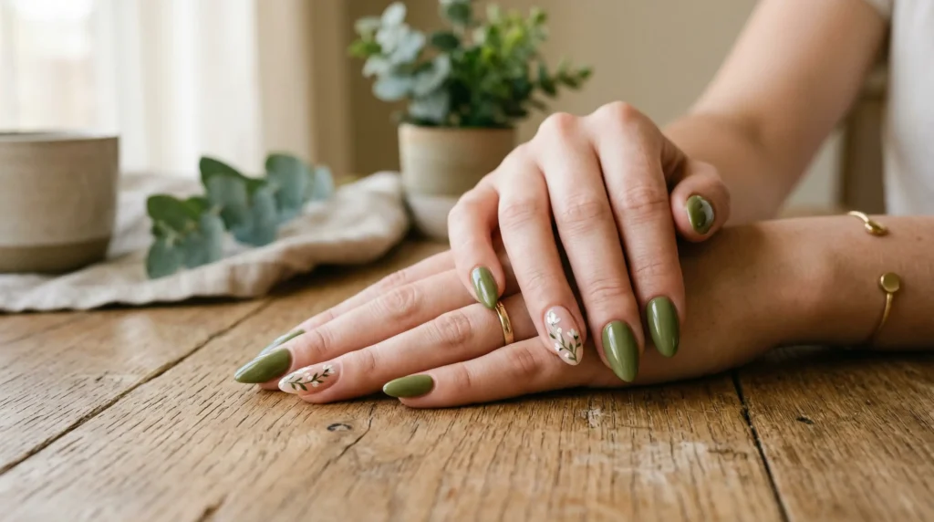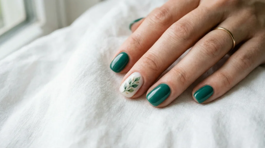 For the technique: always start with meticulous cuticle prep. It makes even simple minimalist nail art look salon-level. Apply two thin coats of your green, then switch to the accent nail. Sketch the leaf outline first, then layer darker and lighter greens for real dimension. Depth is what separates amateur nail art from editorial work. Even one shadow line changes the result completely.
