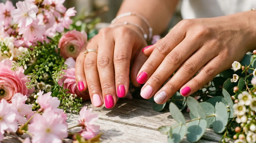The contrast between bold and soft is what makes this spring nail design feel intentional rather than random. The fuchsia makes the pale pink look softer. The pale pink makes the fuchsia look more vibrant. And the single glitter accent gives your eye one final place to rest that rewards looking closer.