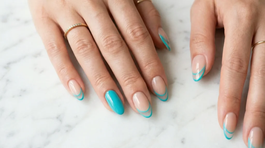 | Turquoise Outline French | Graphic, minimal, sea-fresh | Minimalists wanting color |