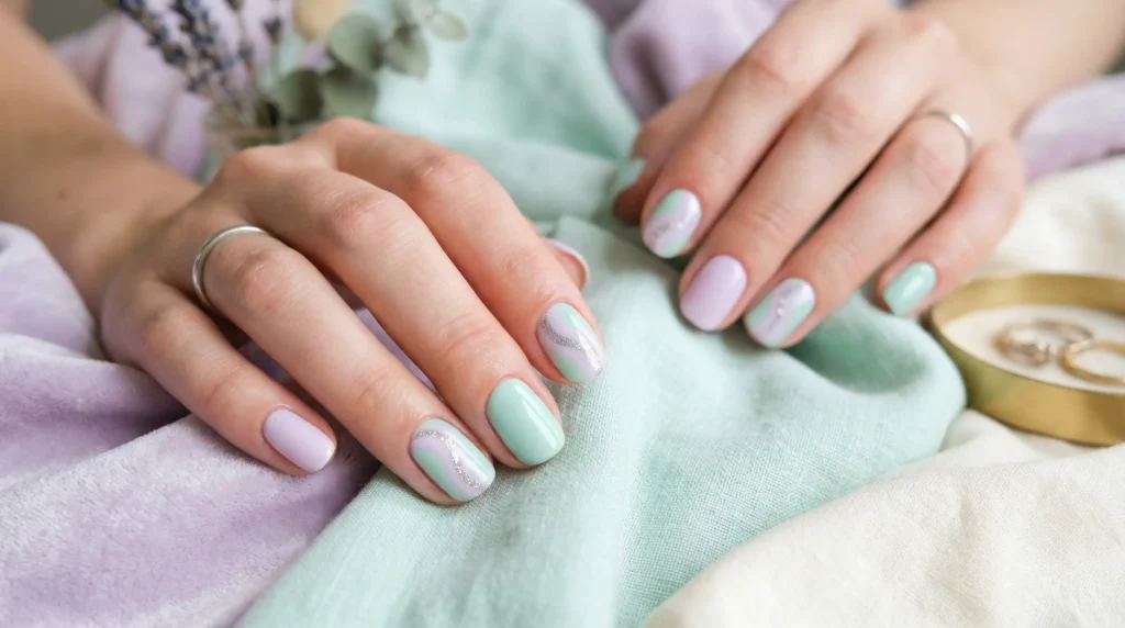 This manicure blends soft mint and creamy lilac in curved, overlapping waves across accent nails, finished with a thin ribbon of silver glitter separating the colors. The remaining nails alternate in solid mint and lilac, all in a glossy short rounded shape. It’s pastel, yes. But the movement and depth elevate it well beyond basic pastel spring nails into something genuinely special.