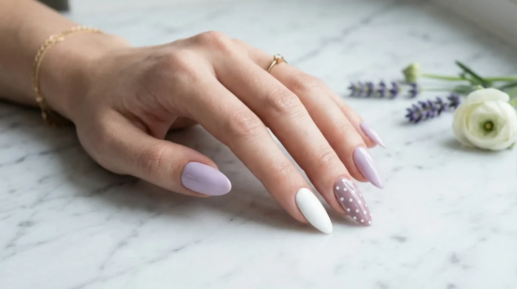 There’s something about lavender that feels like early April light. This elongated almond shape carries a creamy lilac on most nails, balanced with one crisp white accent and another featuring delicate white polka dots over muted mauve. The finish is glossy, almost porcelain-like. These are pastel spring nails elevated: not sugary, not childish, just cool-toned and sophisticated.