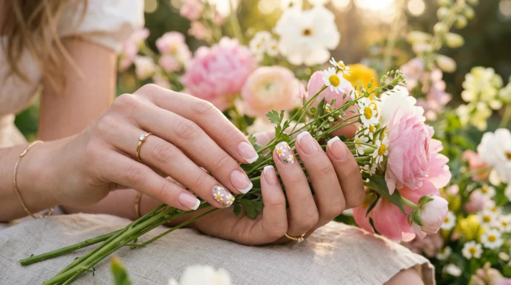 What makes this work beautifully is the combination of a classic structure, the French tip, with a seasonal detail, the daisies. Neither element overwhelms the other. The spring French tip nails provide the foundation and the florals provide the personality. It’s a genuinely clever balance.