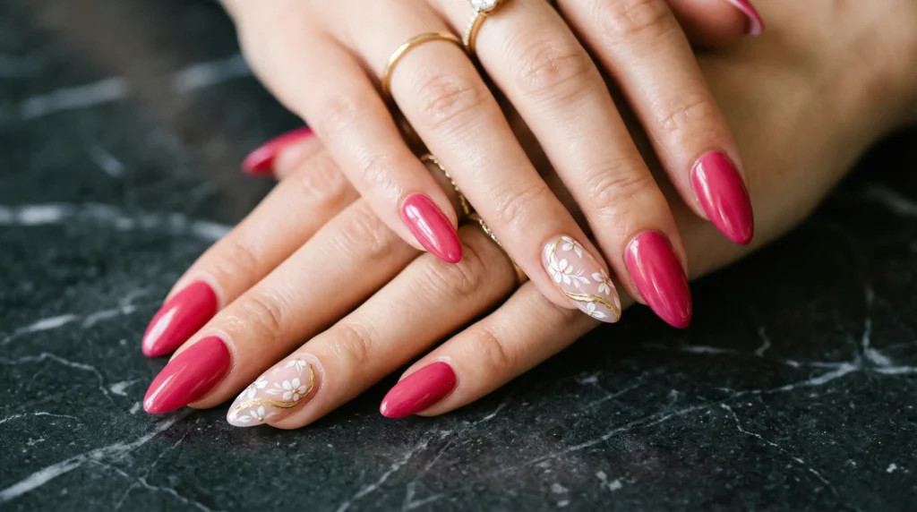 The contrast is everything here. Bold next to soft creates visual tension that makes a spring nail design genuinely interesting rather than just pretty. The deep raspberry pink makes the delicate blush floral accents look more intricate. The fine gold lines look more precious against that saturated base. Neither element works as well without the other.