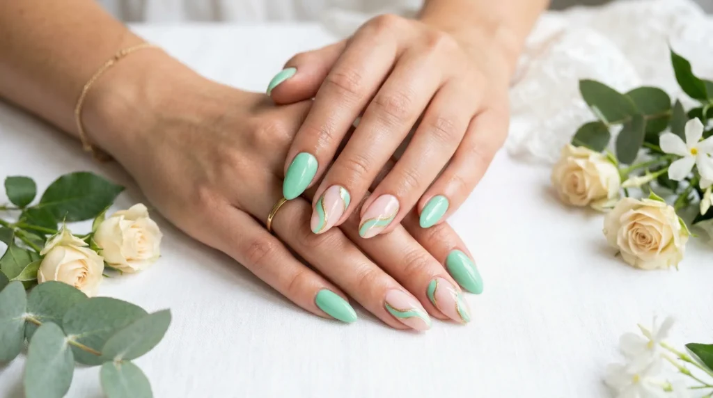 Here’s where green spring nails take a genuinely modern turn. A glossy mint coats most nails, while two accent nails shift into a soft blush base framed by curved mint tips and traced with fine metallic gold lines. Almond-shaped. This is one of those stylish spring nail design 2026 looks that feels both fresh and completely intentional at the same time.