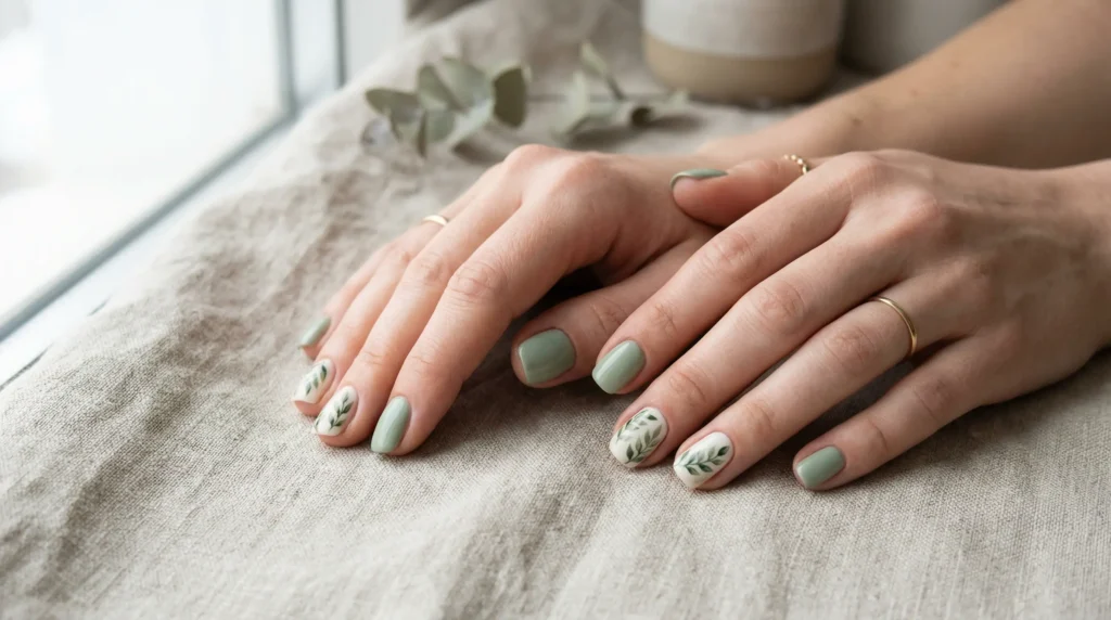 I have a soft spot for greens in spring, but this creamy sage tone feels especially right for 2026. The manicure is built around a rich, glossy teal-green that sits somewhere between mint and eucalyptus. One accent nail shifts to a milky white base, detailed with a delicate hand-painted leafy branch in layered green tones with tiny gold flecks. Short and softly rounded. This is green spring nails done with real restraint.