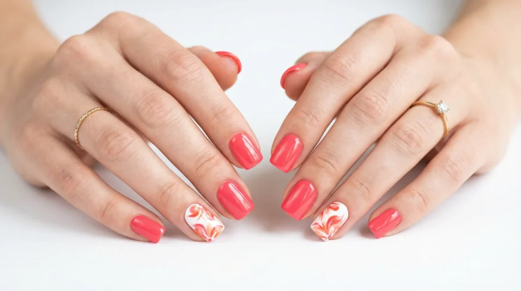 This one is pure energy. A vibrant coral-pink coats most nails in a smooth high-shine finish, while two accent nails feature a crisp white base with fluid coral swirls that mimic abstract petals. Short and softly squared. These are pink spring nails that lean slightly bold without crossing into neon territory, which is exactly the right balance for spring 2026.