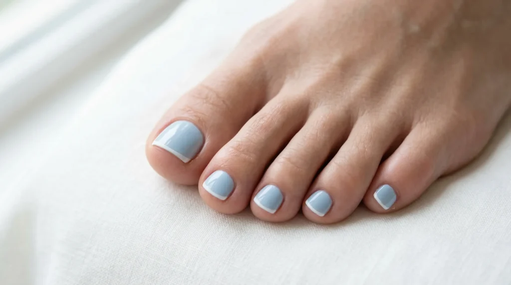 Essie Bikini So Teeny gives that perfect soft pastel blue. OPI Alpine Snow for the micro tip. The trick is scale — the white line needs to be delicate and proportional to the nail size. A thick white tip on a small toenail looks clunky. A thin, precise line looks refined and intentional.