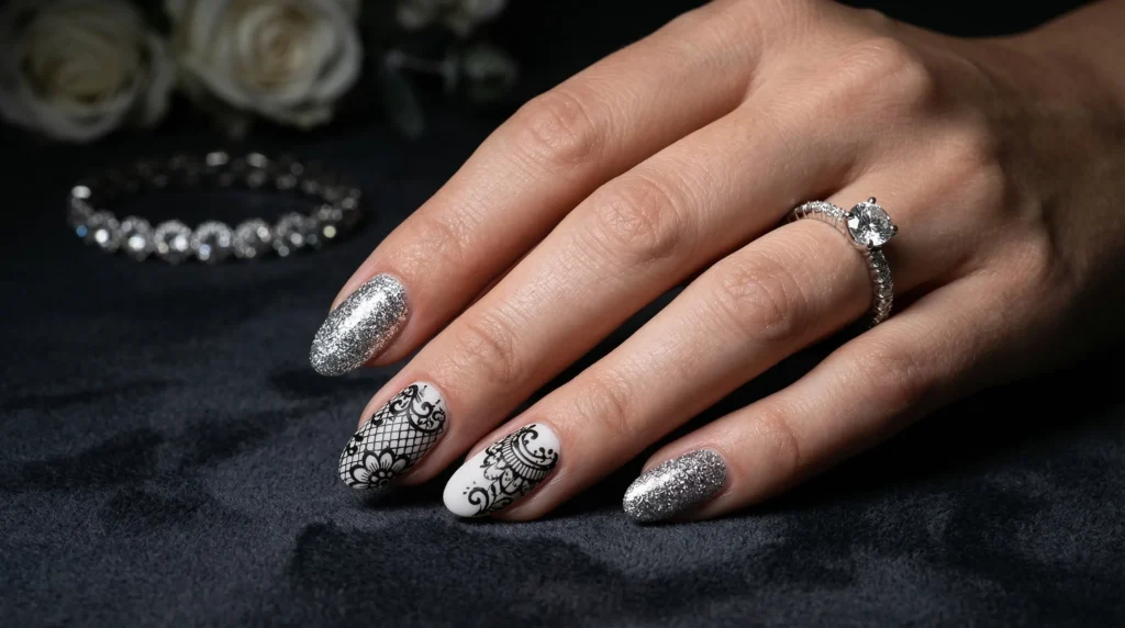 For the bride leaning toward bold elegance, this design brings real drama. Alternating full silver glitter nails with soft white polish carrying intricate black lace-style detailing creates a contrast that’s high-fashion and genuinely striking. There’s also a fluid silver accent that almost melts into the white base — it’s very much an editorial nail.