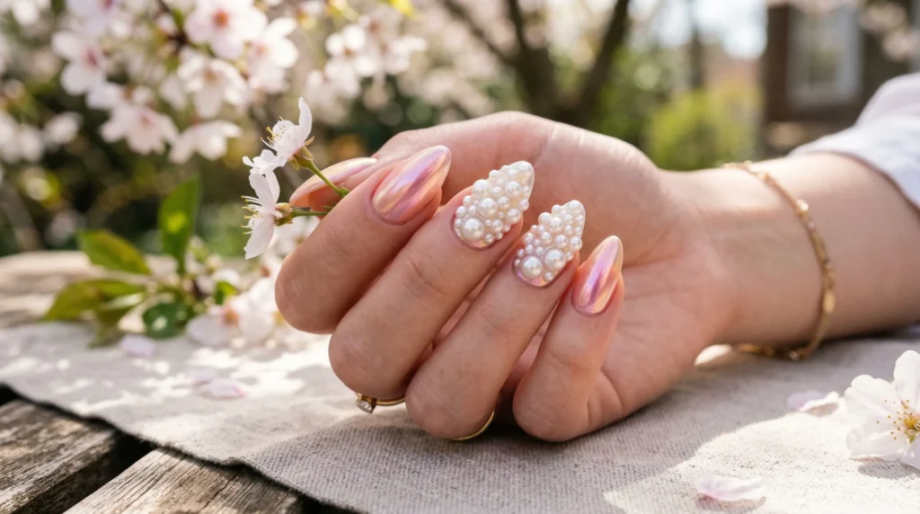 This look is genuinely ethereal. Almond nails coated in an iridescent pearl chrome shimmer with soft green and pink undertones that shift with the light — and two accent nails are adorned with clustered pearls in varying sizes, creating real texture and dimension. It’s romantic, slightly dramatic, and completely bridal.