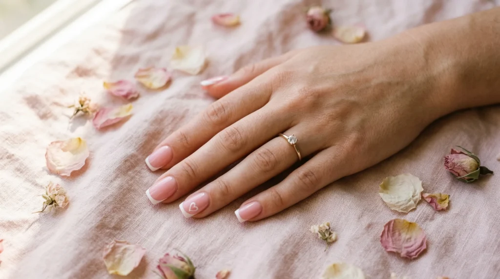 Essie Ballet Slippers for the pink base and Gelish Arctic Freeze for both the tips and the heart outlines work perfectly together. After painting and curing the French tip, draw the heart outline in one continuous motion for clean curves — don’t sketch it in multiple strokes. The heart stays small and delicate, not cartoonish.