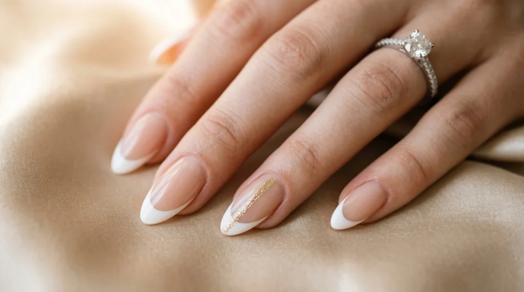 This manicure returns to tradition — almond nails with a soft nude base and crisp white tips — but one accent nail features a vertical sweep of fine gold glitter running from cuticle to tip like a champagne ribbon. It’s timeless and celebratory at the same time.