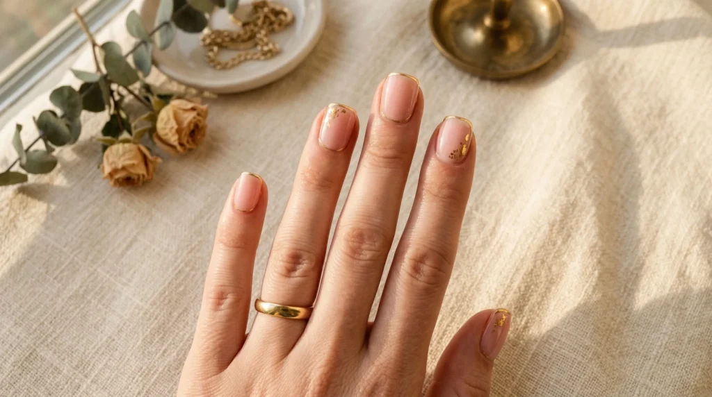 Instead of a traditional white tip, this design replaces it with a delicate gold outline framing the nail’s perimeter — and scattered gold foil fragments melt softly near the corners of a translucent blush base. It’s understated, but quietly luxurious. The kind of detail that takes a second to notice and then you can’t stop looking at it.
