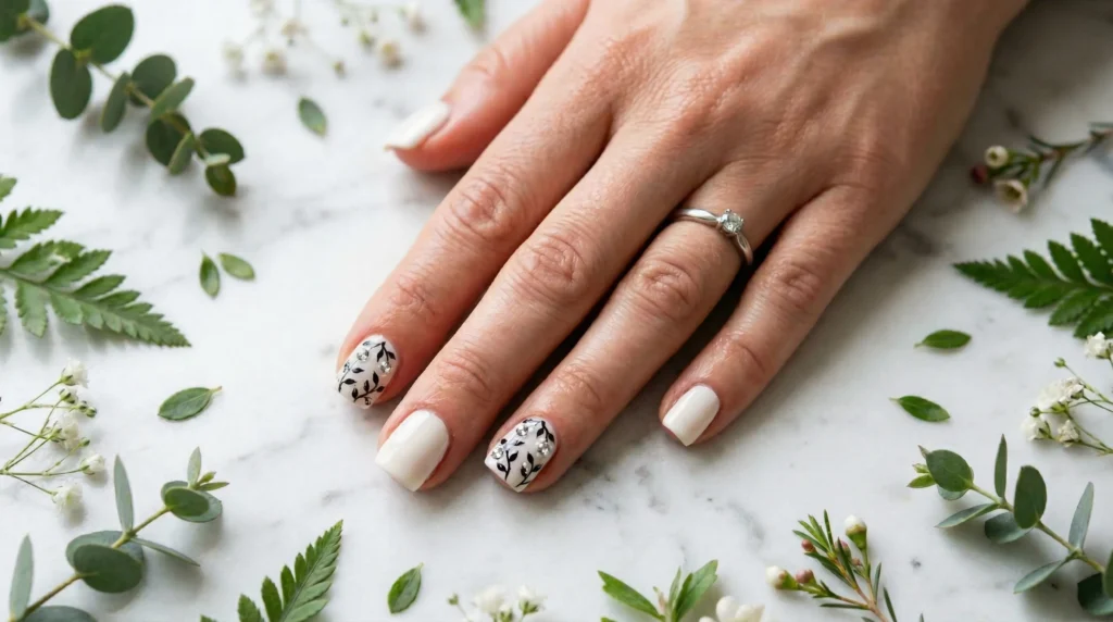 The final look in this guide is one of the most poetic. A creamy white base on short square nails, with two accent nails carrying delicate black vine-like florals hand-painted with tiny crystal centers. The contrast is subtle but graphic — it’s artistic and timeless at once, with just enough edge to feel current.