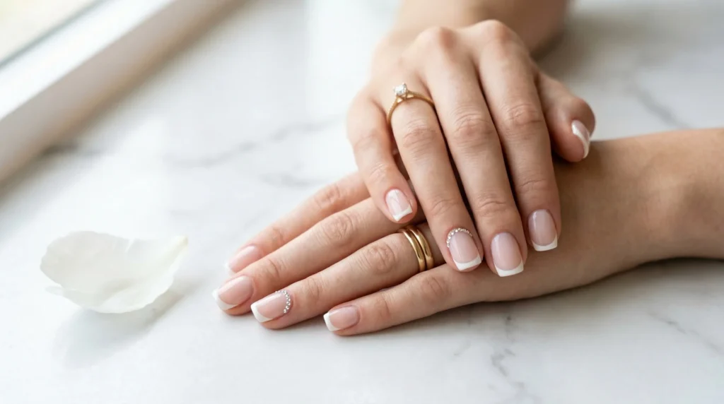 The French tip manicure has been a bridal staple for decades, but this spring’s version is a real step up. The base is a sheer milky blush — that barely-there pink that makes hands look genuinely expensive. The white tips are slightly squared, and what makes it feel current is the delicate line of micro-crystals framing the smile line on the accent nails.