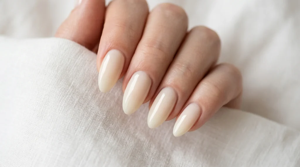Sometimes the most powerful nail look is barely there. These almond-shaped nails coated in a sheer milky ivory — no crystals, no art, just luminous, perfectly-shaped simplicity — are genuinely striking in person. This is quiet luxury bridal nail art at its most confident.