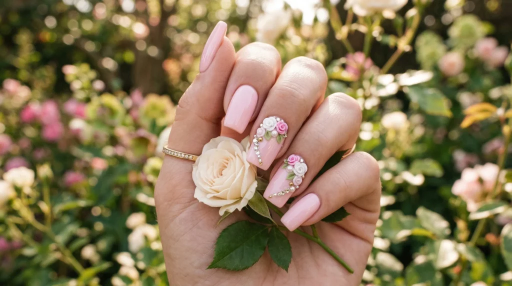 Now here’s where it gets truly romantic. A creamy baby-pink base on soft square nails, with two accent nails featuring tiny 3D sculpted flowers and gently curving rhinestone trails. It’s feminine and joyful without tipping into overly sweet territory — and it photographs beautifully against a bouquet.