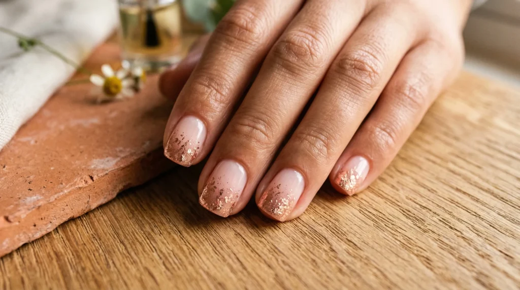 A sheer blush base with rose gold foil fragments concentrated along the tips in a loose French fade — this look is airy, imperfect in the most intentional way, and quietly chic. It doesn’t look structured or stiff; it looks like warmth and light.