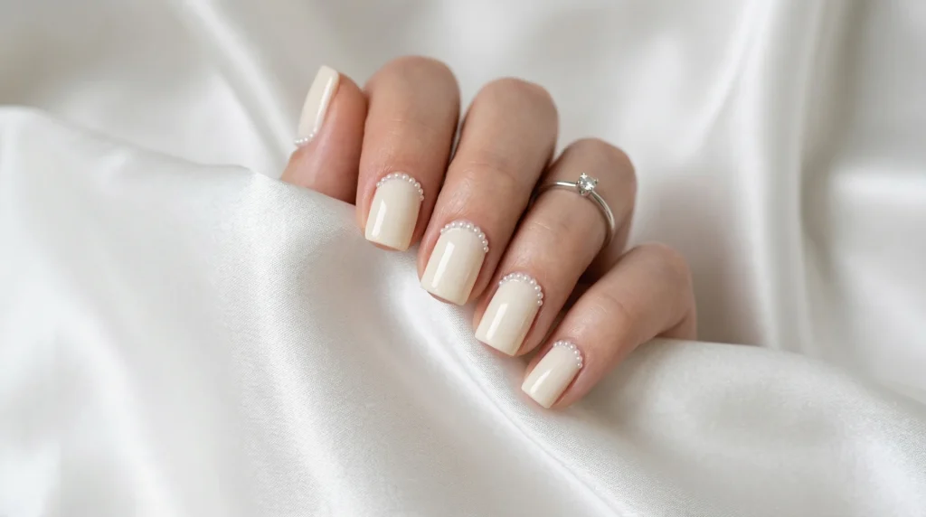 Pure ivory on short square nails with a delicate arc of micro-pearls tracing the cuticle line — this design is couture in its restraint. It’s not asking for attention, but it commands it anyway. The pearls feel like jewelry placed exactly where it matters most.