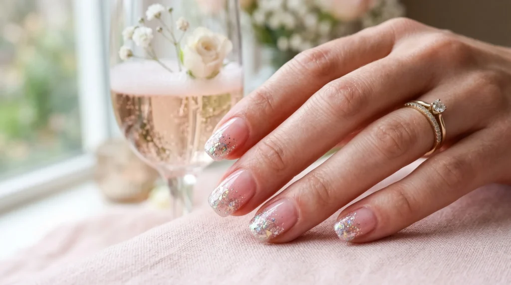 Think of this as champagne bubbles translated into a manicure. A translucent rose-pink base melts into soft glitter and iridescent foil fragments concentrated toward the tips — subtle sparkle without full glitter overload. It’s light, it’s modern, and it has just enough magic to feel bridal.