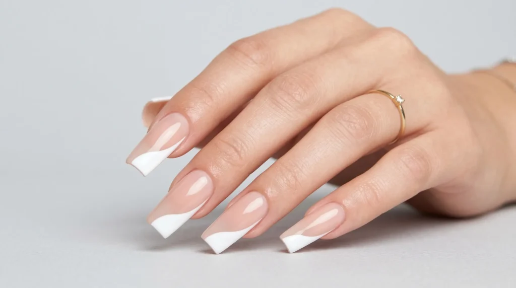 This one is for the modern bride who loves structure but doesn’t want to be predictable. Long square nails with a sheer nude-pink base are accented by curved white waves sweeping diagonally across the tips — it’s technically a French, but completely reimagined. Fluid, dynamic, almost architectural.