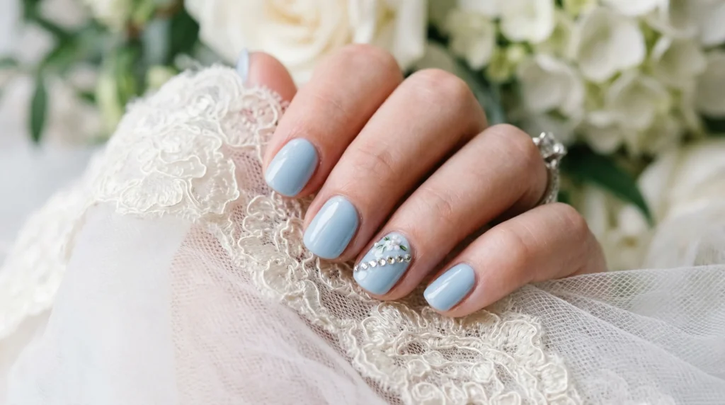 Here’s a style that surprises people every time — in the best way. Short rounded nails in a creamy pastel blue, cool and polished, with one accent nail featuring a horizontal crystal line and a tiny floral detail. It’s a graceful nod to ‘something blue’ that feels genuinely chic rather than literal.