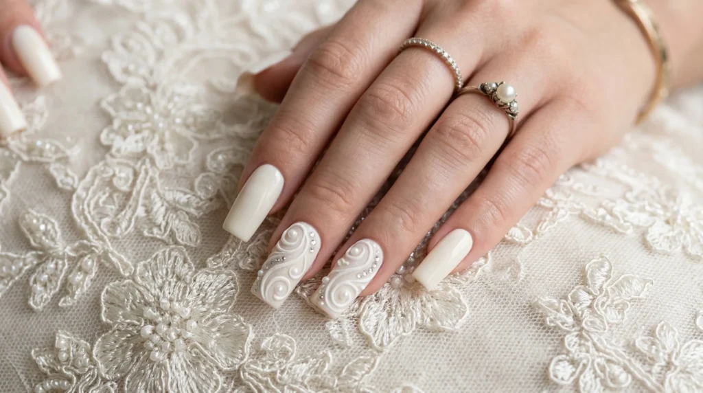 In my experience, this is the bridal nail art that gets the most compliments at the reception. Brides wearing embroidered lace or tulle gowns especially love it because the nail art quietly mirrors the texture of the dress. It’s intricate, but it’s never cluttered.