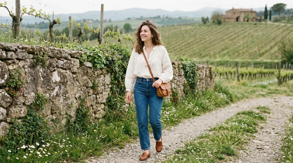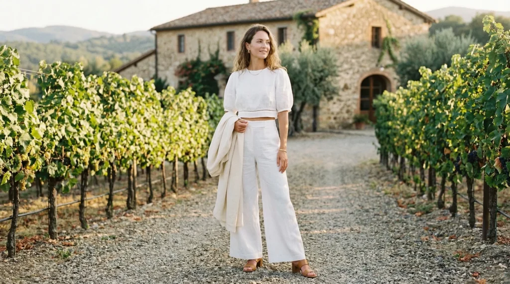 A woven bag and simple sandals reinforce the effortless tone. And practically speaking, this is one of the most flexible winery outfits on the list — easy to adjust as the day warms up or cools down, always photographs well without feeling staged.