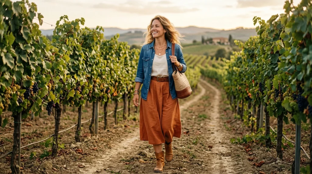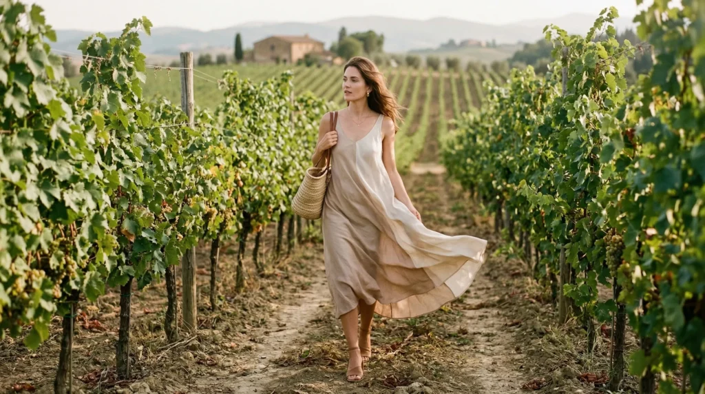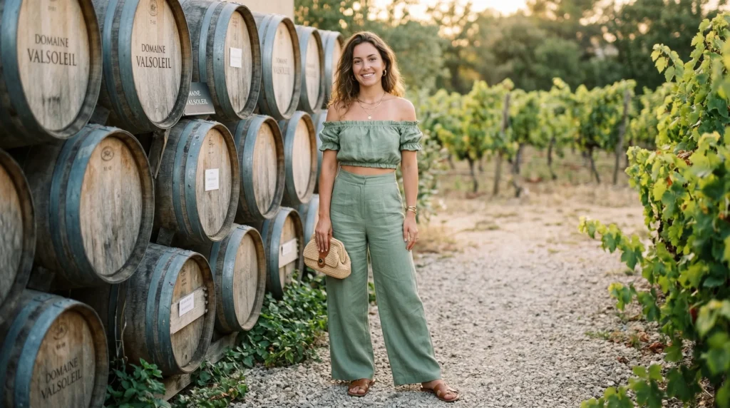 I’ve been paying close attention to what actually works in a winery context this season. Not what looks good on a runway, but what holds up when you’re walking between barrels, standing in dappled vineyard light, and sitting across a rustic wooden table with a glass of something cold. These 15 looks answer that question honestly.