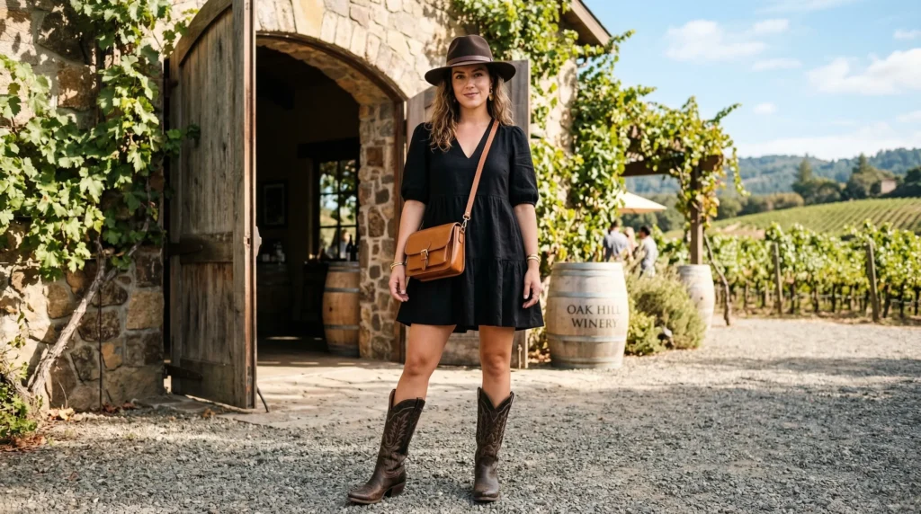 The key is balance. The structured crossbody bag and hat soften the edge. The mini dress keeps proportions light. The boots are the statement — they change everything about the outfit’s energy while remaining completely practical for vineyard terrain.