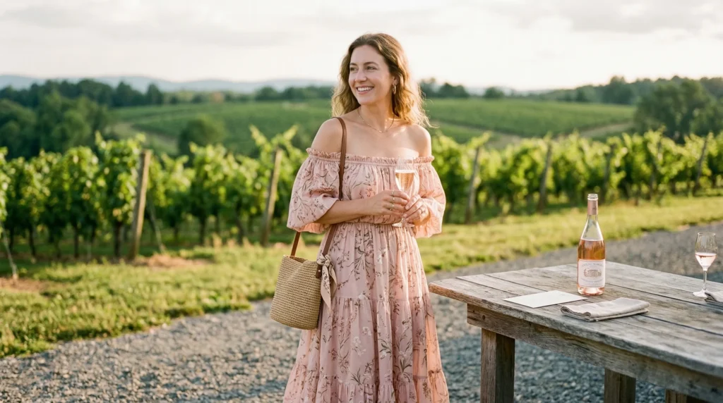 There’s a very specific kind of pressure that comes with planning a winery outfit. You want to look put together — but not overdressed. You want to feel comfortable — but not like you grabbed whatever was on the floor. And somewhere in the back of your mind, you know photos are going to happen whether you’re ready or not.