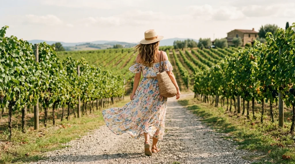 stylish winery outfit spring 2026 vineyard looks dressing is really about one thing: looking effortless while actually being thoughtful. The best vineyard looks aren’t accidents. They’re just well-chosen pieces that work with the setting — warm afternoons, uneven gravel paths, long tastings that stretch into golden hour.