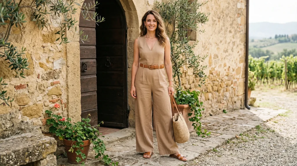 Now here’s where it gets interesting — because a neutral jumpsuit might be the most underrated stylish winery outfit spring 2026 option on this entire list.