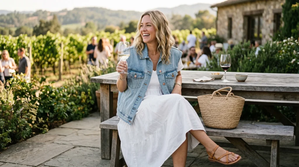 Layering a sleeveless denim vest or jacket over a soft white dress is one of those combinations that genuinely never fails. It brings structure, adds personality, and still feels casual enough for a relaxed vineyard afternoon.