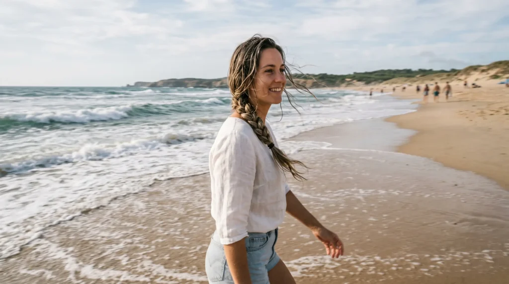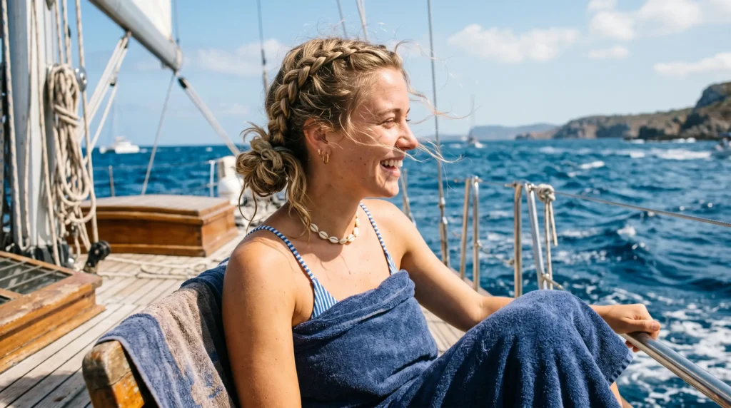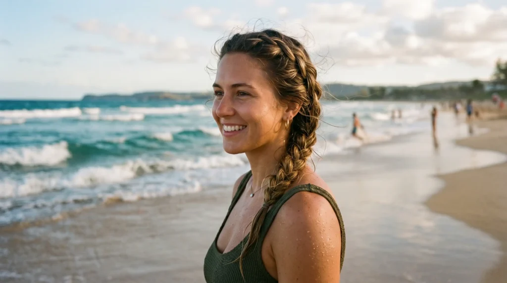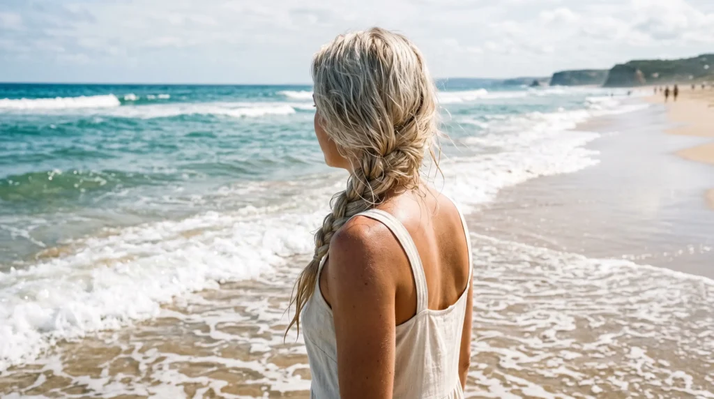 What I’ve learned the hard way: tight doesn’t always mean better. A braid like this needs prep. Running a bit of leave-in conditioner through damp hair before braiding keeps the hair flexible rather than crunchy — especially important when you’re moving between ocean and sun.