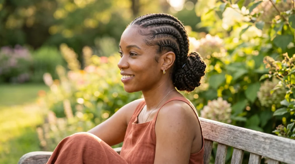 Braids leading into a low coiled bun — clean, sculpted, completely secure. The kind of style that doesn’t move no matter how active your day gets. If your main concern is protection, this is one of the smartest protective hairstyles for swimming you can choose. The ends are tucked, the structure holds, and exposure to both sun and chlorine is minimized.