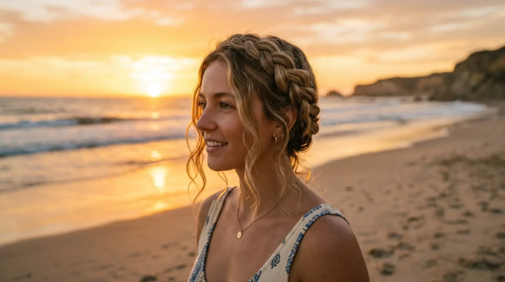 A halo braid wrapped around the head — soft and intentional, keeping everything off your neck while still feeling like it belongs at both a beach day and a dinner reservation. This is the braided hairstyle for the beach that genuinely transitions without adjustment.