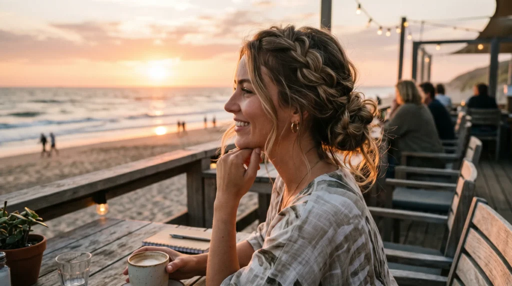 A braid that wraps and folds into itself with airy texture — not overly tight, a few loose strands catching the light. This is the braided hairstyle for the beach for days that turn into dinners. Thoughtful without screaming effort. The slightly undone texture after saltwater actually looks better than anything styled from scratch.