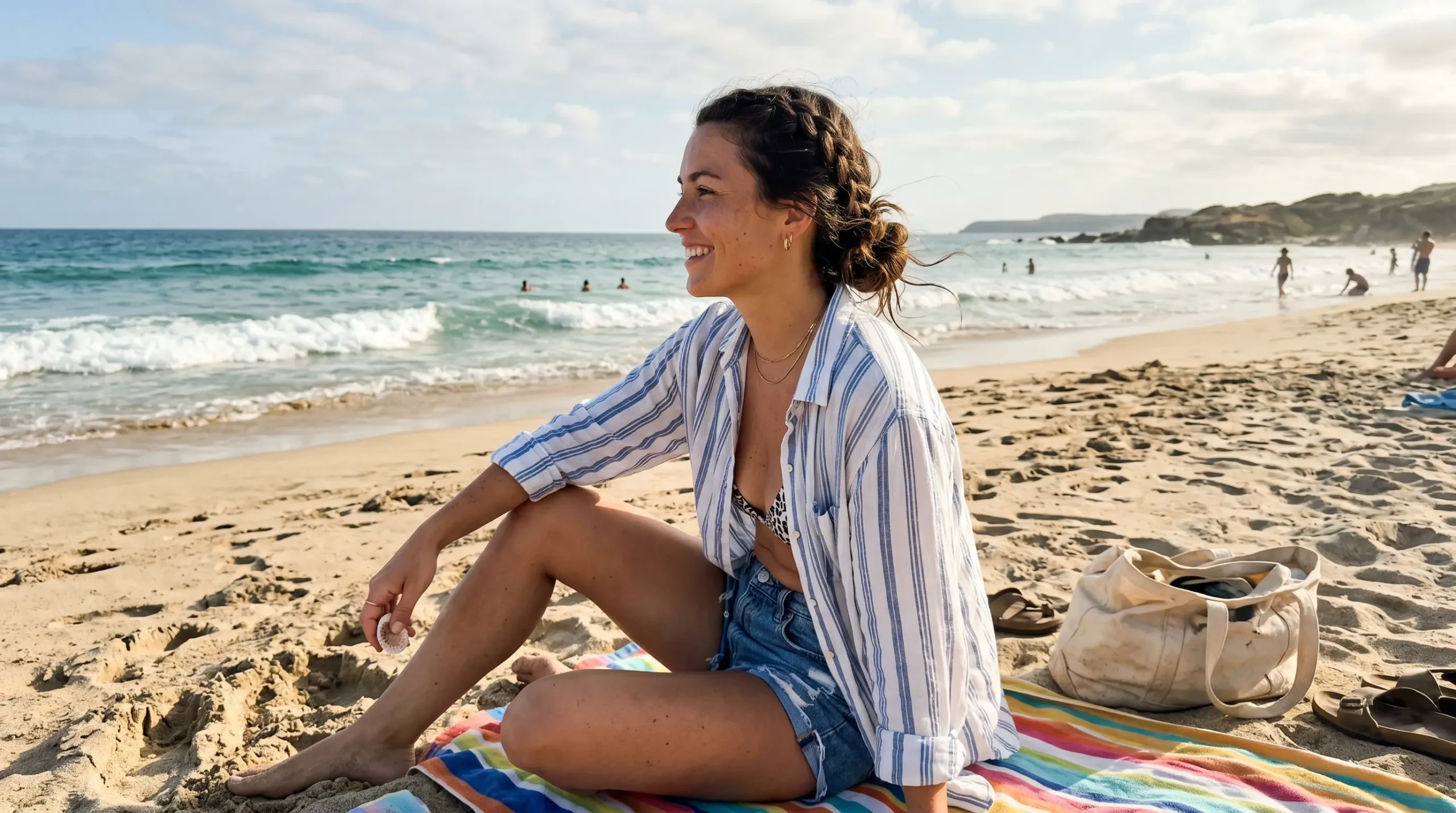 For days like this, a lightweight primer or cream through the hair before braiding keeps everything soft even after saltwater exposure. The texture works with the environment rather than fighting it.