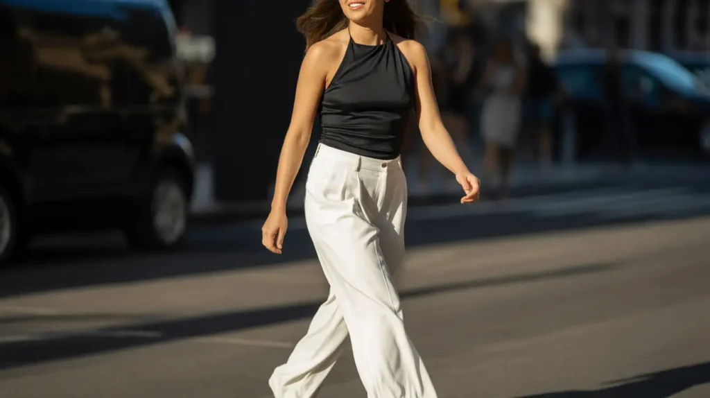 | Clean Lines Halter + White Trousers | Quiet luxury | Dinners, events | Oversized gold earrings | Low |