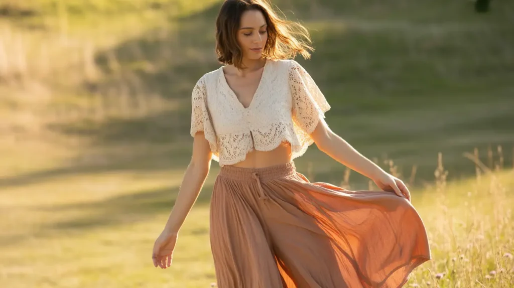 | Lace Crop + Wide-Leg Pants | Boho effortless | Beach towns, events | Layered necklaces | Low |