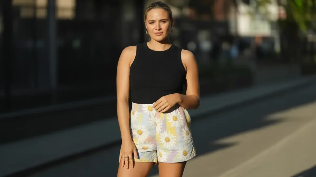 Key pieces: Black structured sleeveless top, daisy-print shorts, flat sandals, layered necklaces. Best for: Weekend outings, casual lunches, versatile day-to-evening dressing.
