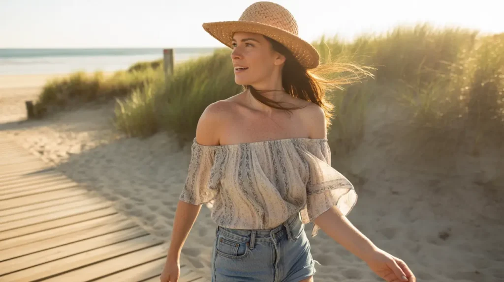 Key pieces: Lightweight off-shoulder knit, simple shorts, earthy jewelry, structured tote. Best for: Coastal days, evening walks, any time the breeze picks up.
